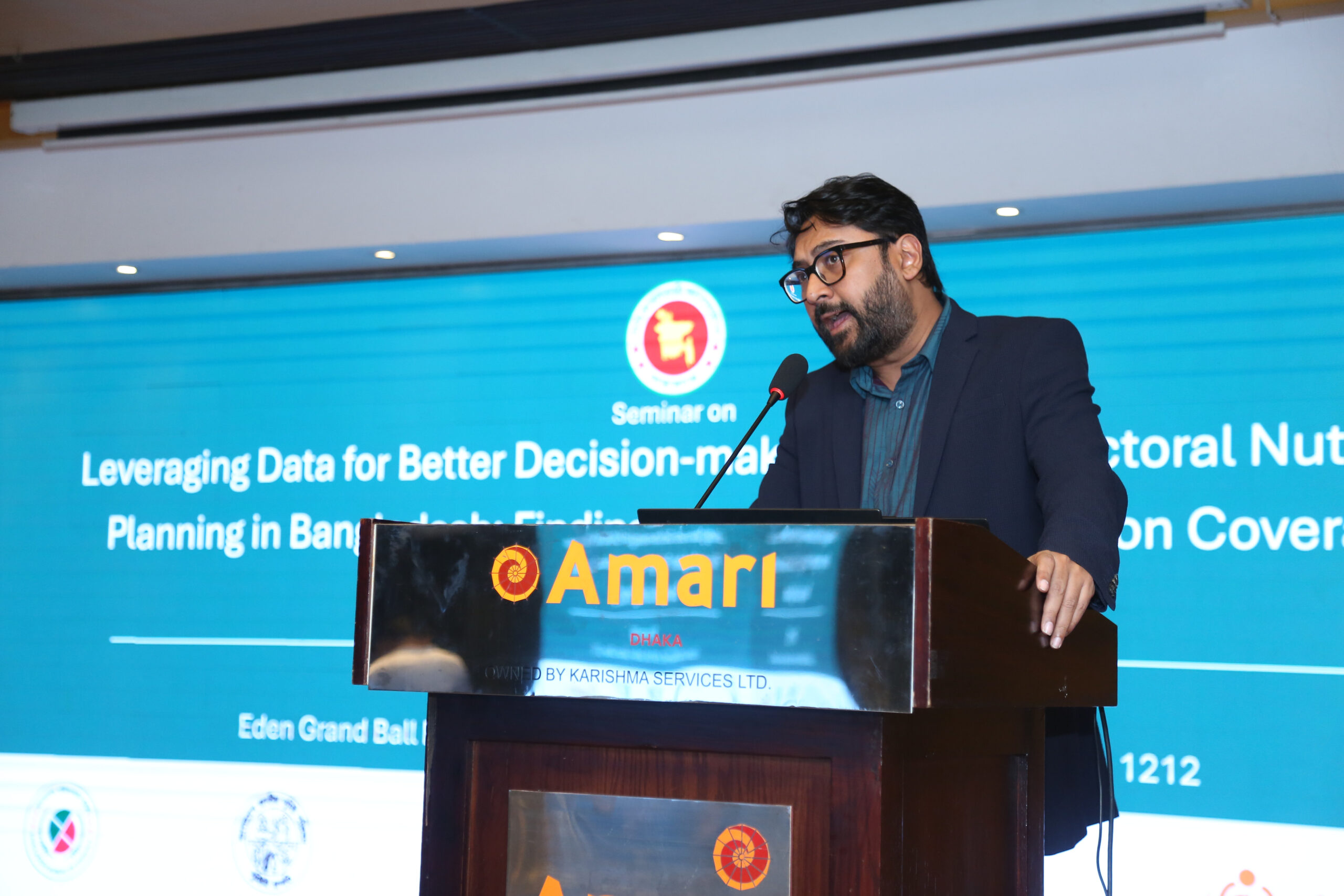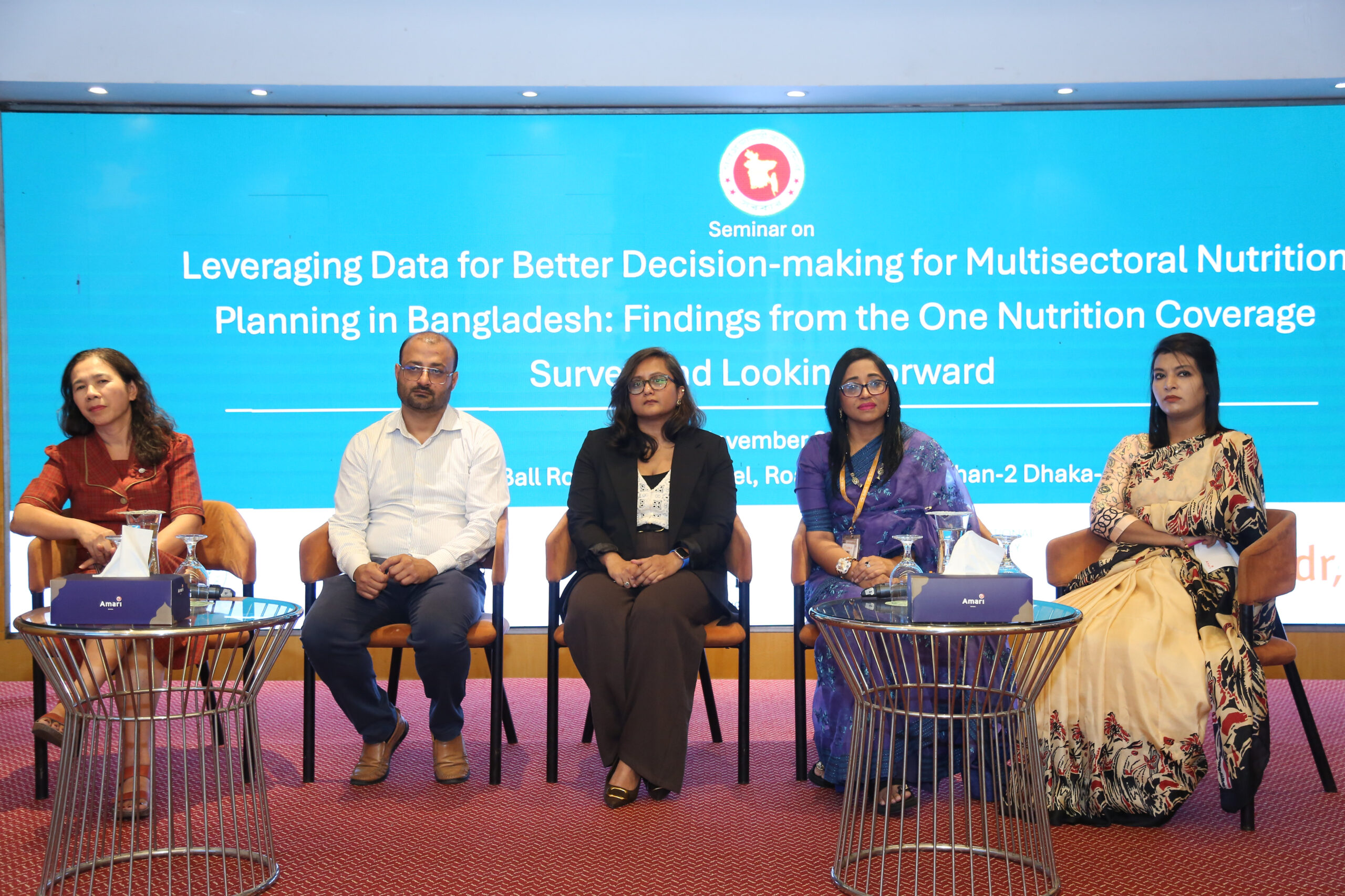 The seminar “Leveraging Data for Better Decision-Making for Multisectoral Nutrition Planning in Bangladesh”, held on 26 November 2025 at Amari Hotel, Dhaka, brought together participants from government leaders, researchers, and development partners to discuss findings from the One Nutrition Coverage Survey (ONCS) and future directions for strengthening nutrition planning. The event featured opening remarks from Bangladesh National Nutrition Council’s (BNNC) leadership and IFPRI, followed by technical presentations on multisectoral nutrition intervention coverage, survey design, equity and co-coverage results, and costing analysis. A high-level expert panel from icddr,b, BNNC, GAIN, and UNICEF highlighted opportunities to improve data use, coordination, and accountability across sectors. Special guests from Institute of Public Health and Nutrition, Food Planning and Monitoring Unit, and Public Health Wing under Health Services Division provided closing reflections, emphasizing the importance of evidence-driven policy for advancing nutrition outcomes in Bangladesh.